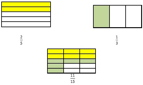 En un segundo momento de la clase los estudiantes procedieron a representar las fracciones 2/5, 1/3 y 11/15 en hojas de cuaderno doblándolas como se indica en la figura siguiente.